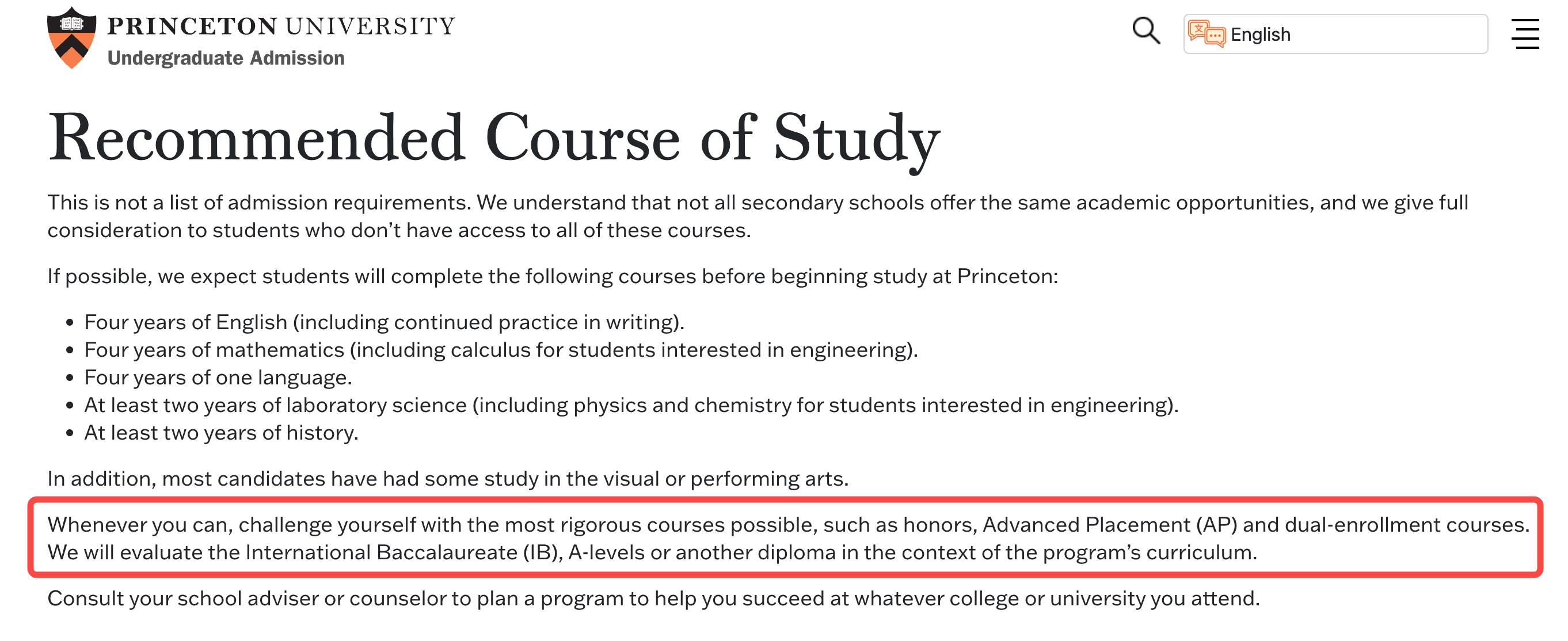 Princeton encourages applicants to take the most rigorous courses available. Their message is clear: challenge yourself with high-level coursework like AP.