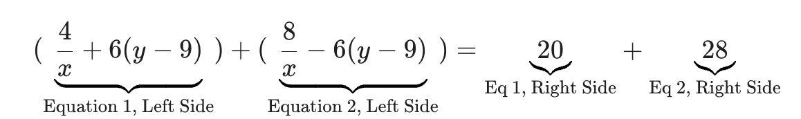 Take a look at our two equations, notice anything special about the y terms? In the first equation, we have +6(y-9), and in the second, we have -6(y-9). They are perfect opposites!